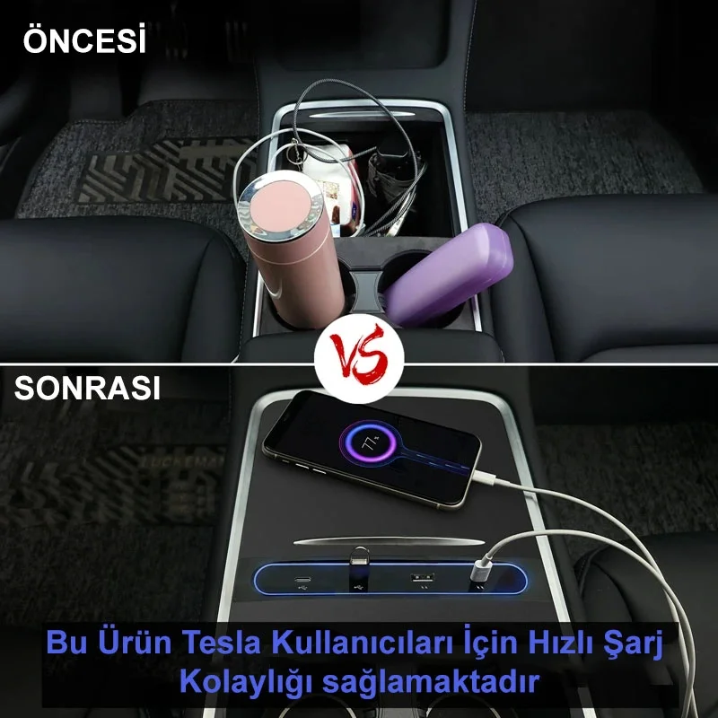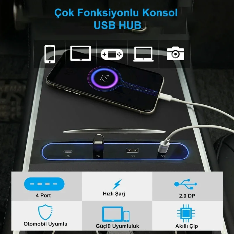 2021-2022 Tesla Model 3/Y Uyumlu 27W Hızlı Şarj USB Hub İstasyonu & Araç Adaptörü