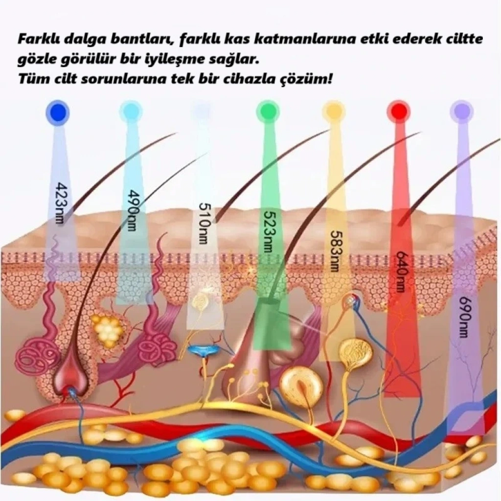 Cilde 1–2 mm nüfuz eder, kolajen üretimini destekler, kırışıklık ve yaşlanma belirtilerini azaltır. Sarı Işık: