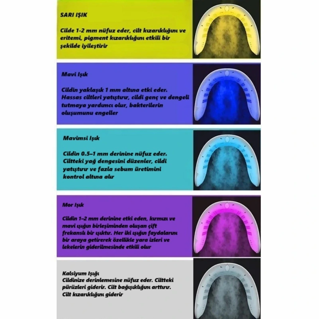 Cilt tonunu eşitler, renk farklılıklarını azaltır, parlaklık kazandırır. Beyaz (Kalsiyum) Işık: Cilt dokusunu güçlendirir, gözenekleri sıkılaştırır ve bağışıklığı destekler.