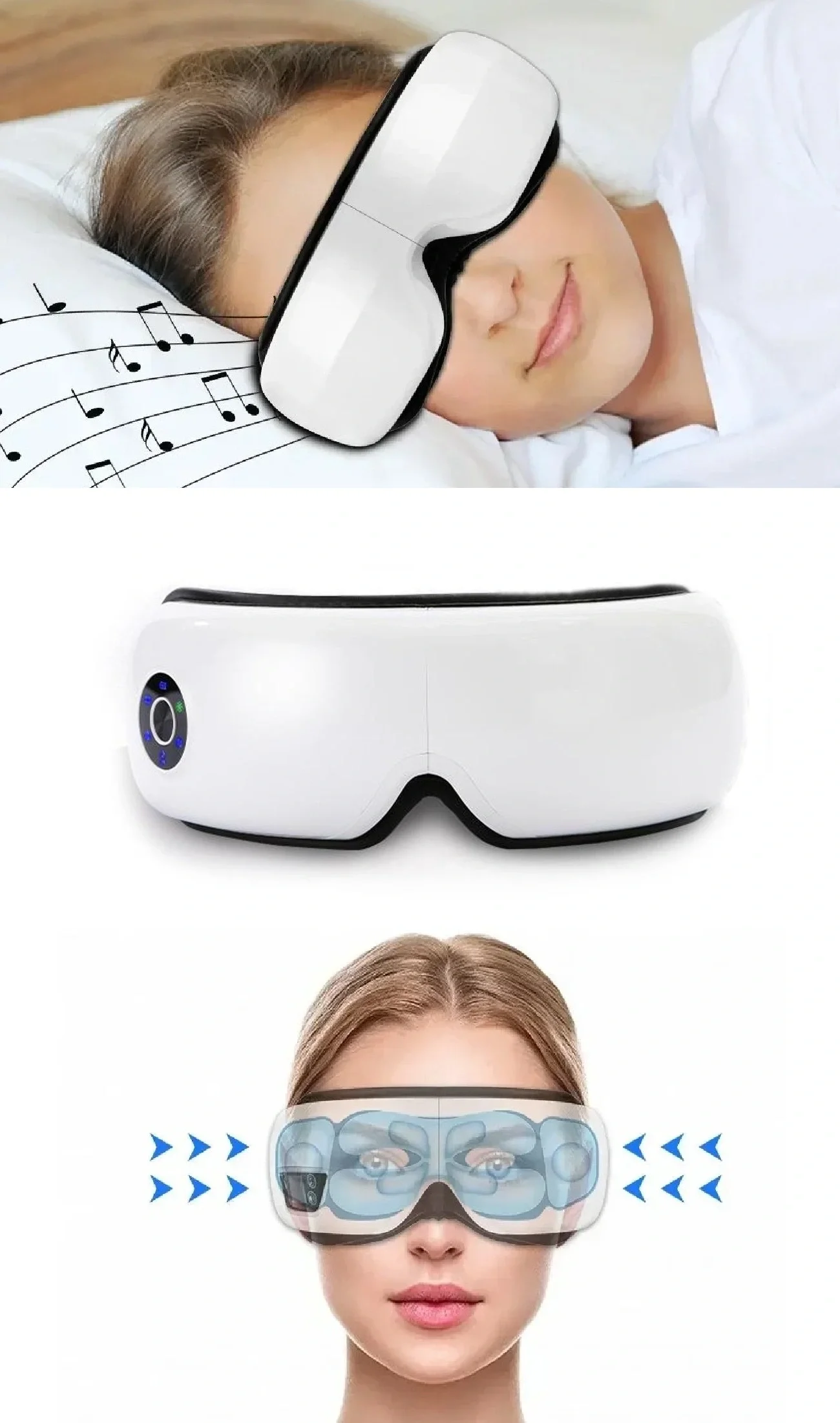 Akıllı hava yastıkları, göz çevresine ritmik bir şekilde basınç uygulayarak profesyonel spa etkisi yaratır.