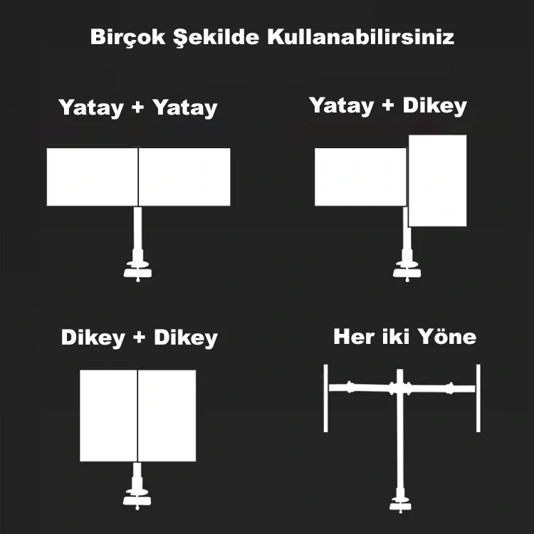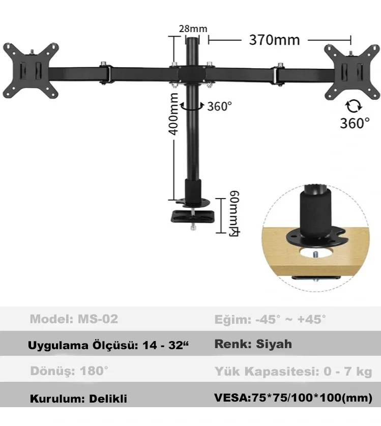 Masaüstü Ayarlanabilir 14-32” Çift Kol Monitör Tutucu