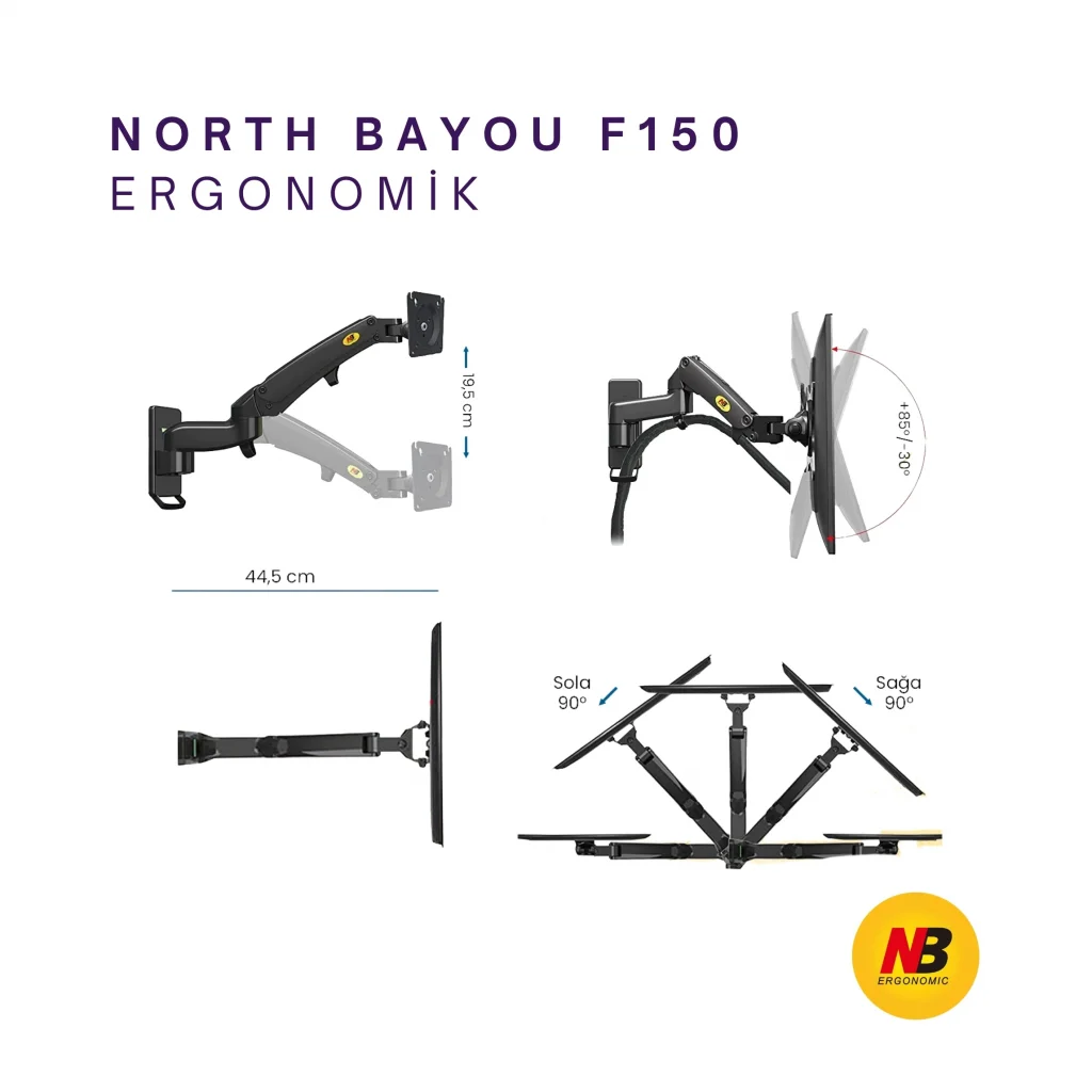 North Bayou F150, LED ve LCD monitörlerinizi veya TV’lerinizi duvara monte ederek hem alan tasarrufu sağlar hem de ergonomik izleme imkânı sunar. Dayanıklı alüminyum gövdesi ve gaz yaylı mekanizması sayesinde ekranınızı istediğiniz açıya kolayca ayarlayabilirsiniz.